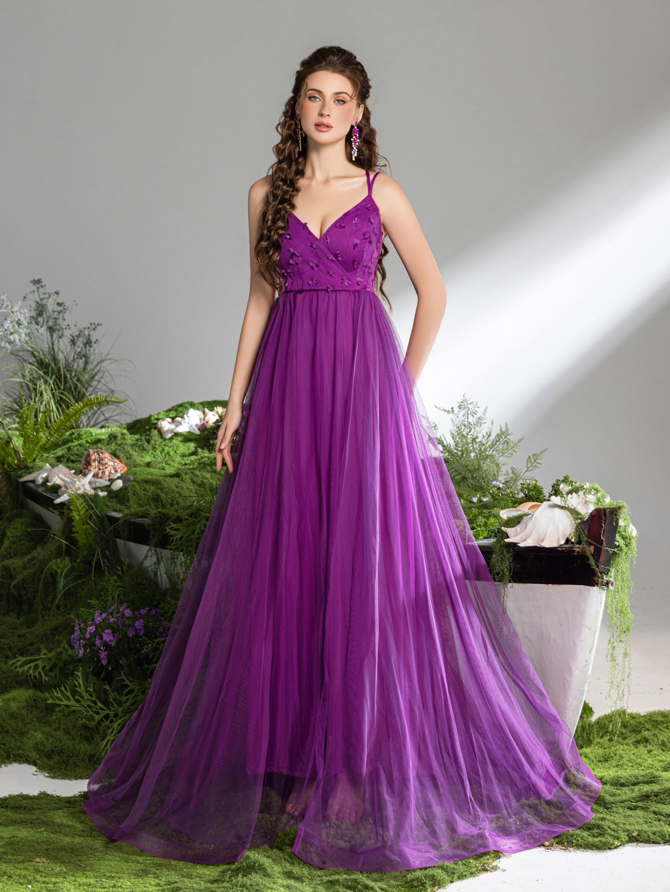 Emanate elegance and charm with this stunning evening gown. This gown features a V-neckline and delicate spaghetti straps, providing a classic and sophisticated look. The bodice is adorned with intricate floral appliques, adding a touch of romantic elegance. The back of the gown showcases a unique criss-cross lace-up design, ensuring a perfect and adjustable fit.The full-length skirt is made of layers of soft tulle, creating a voluminous and ethereal silhouette that moves gracefully with every step. The rich color exudes confidence and royalty, making it perfect for proms, galas, or any formal event where you want to make a lasting impression.
