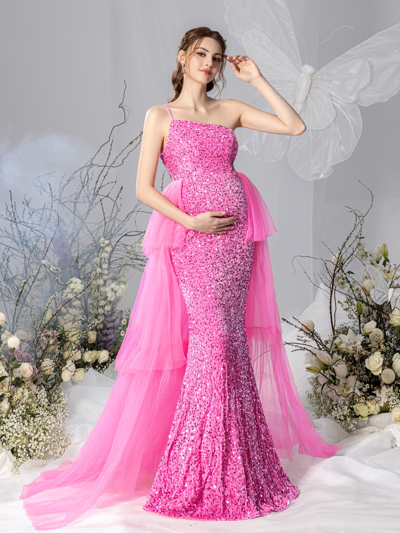 Step into the spotlight with our radiant maternity gown, a true celebration of your pregnancy glow. This enchanting gown features a delicate spaghetti strap neckline and a fitted silhouette that gracefully contours your figure. The soft, stretchy fabric is adorned with a dazzling array of sequins, adding a touch of glamour and sparkle to your look. The gown is beautifully layered with airy tulle, creating a flowing, ethereal effect as it cascades down into a sweeping train.