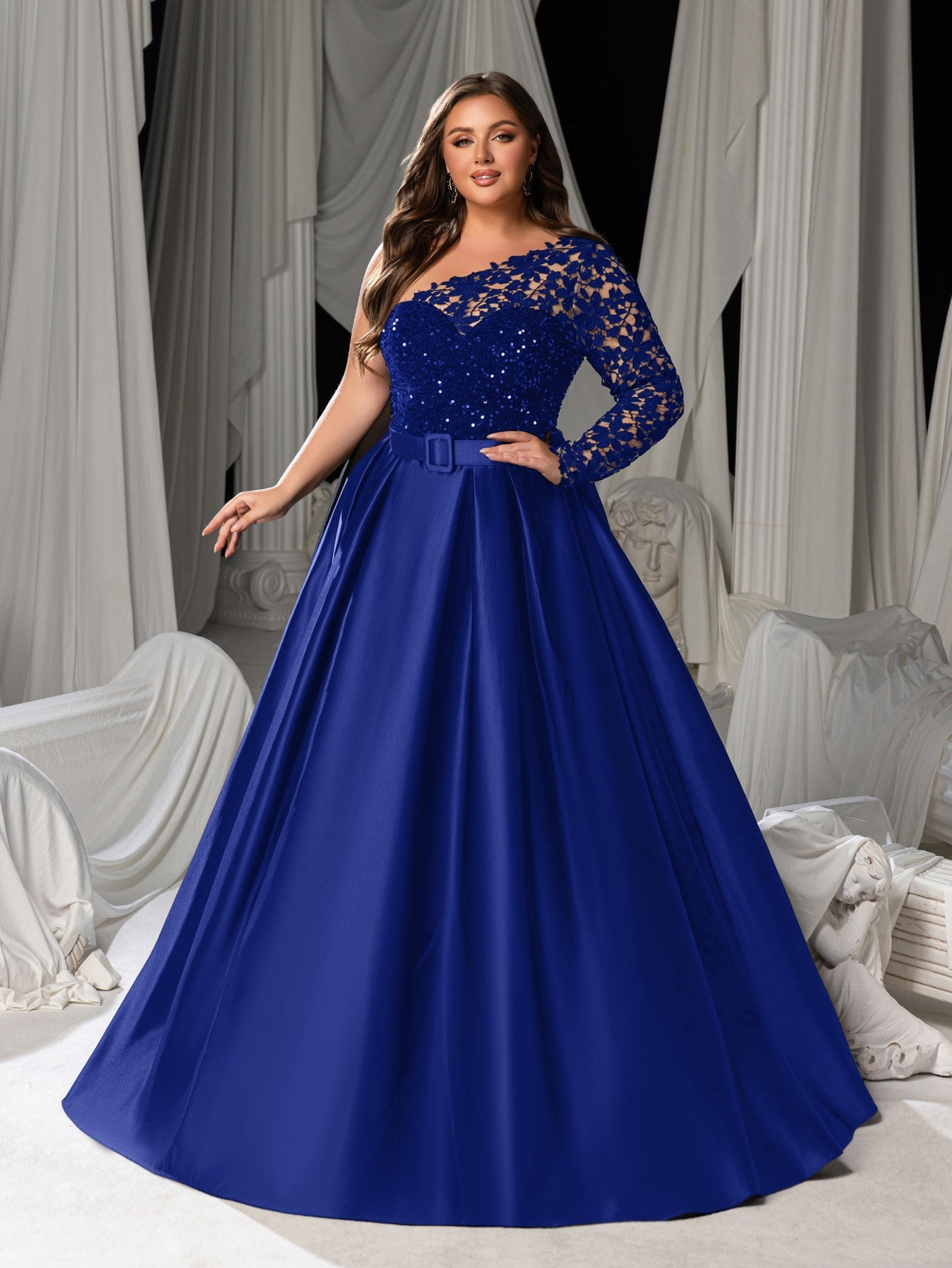 Plus Size Elegant Lace One-Shoulder Evening Gown - Formal Dress with Single Sleeve & Waist Belt