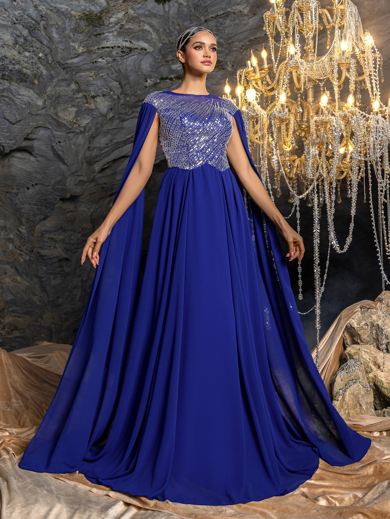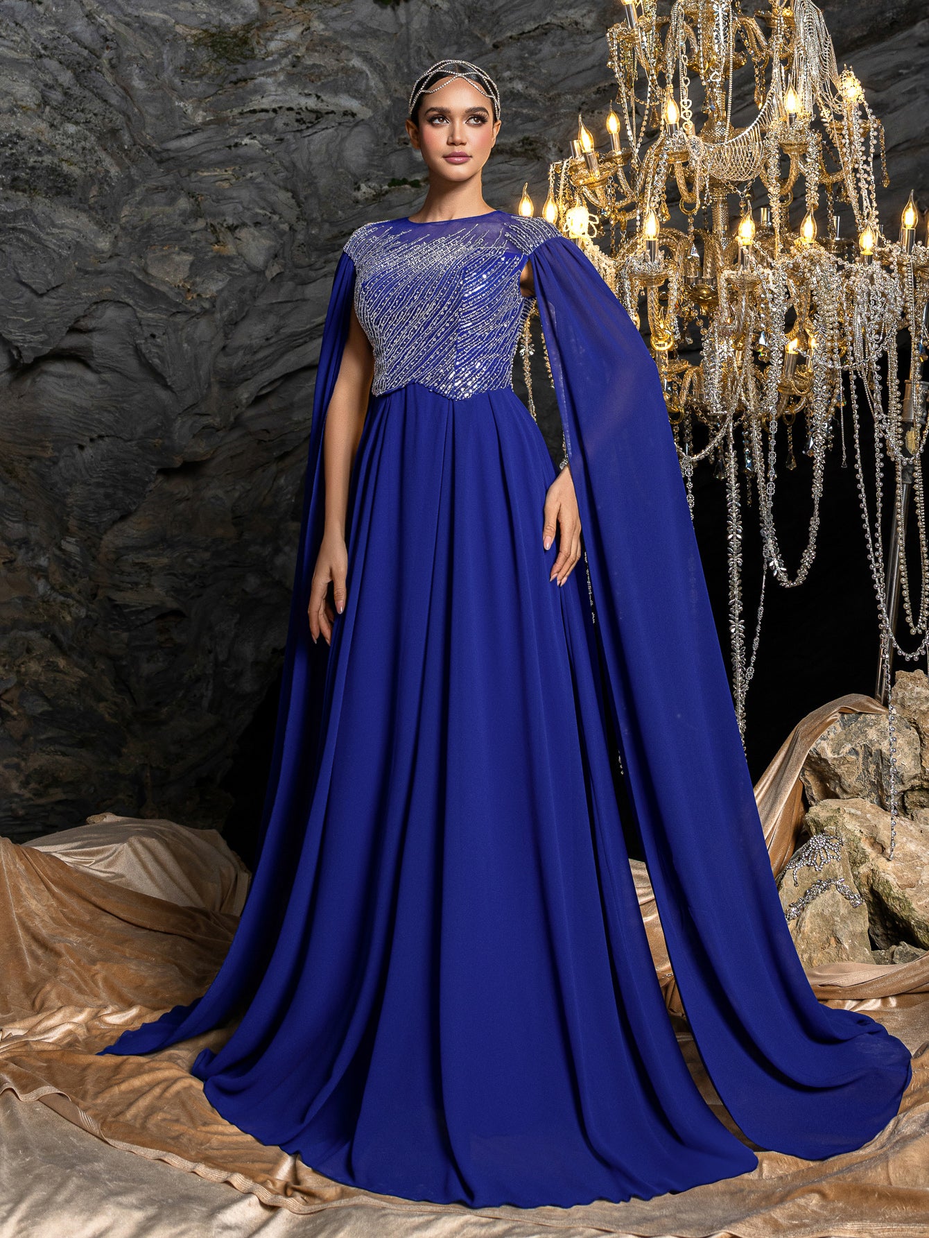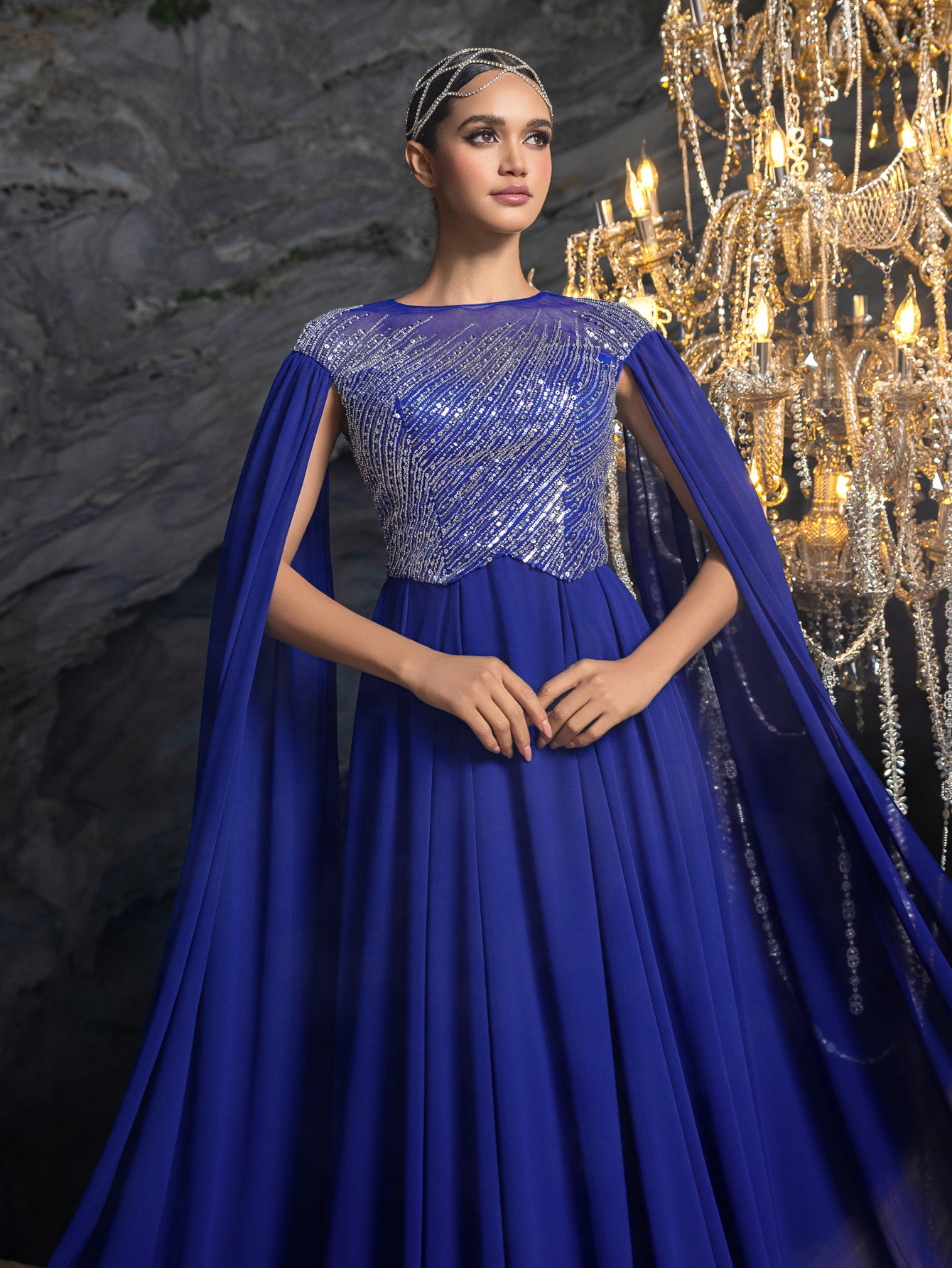 Ideal for black-tie events, charity balls, or VIP weddings, this gown’s fusion of bold embellishment and fluid chiffon makes it a versatile statement piece. The cape sleeves and back detail add unexpected drama, while the lightweight fabric ensures ease of wear.