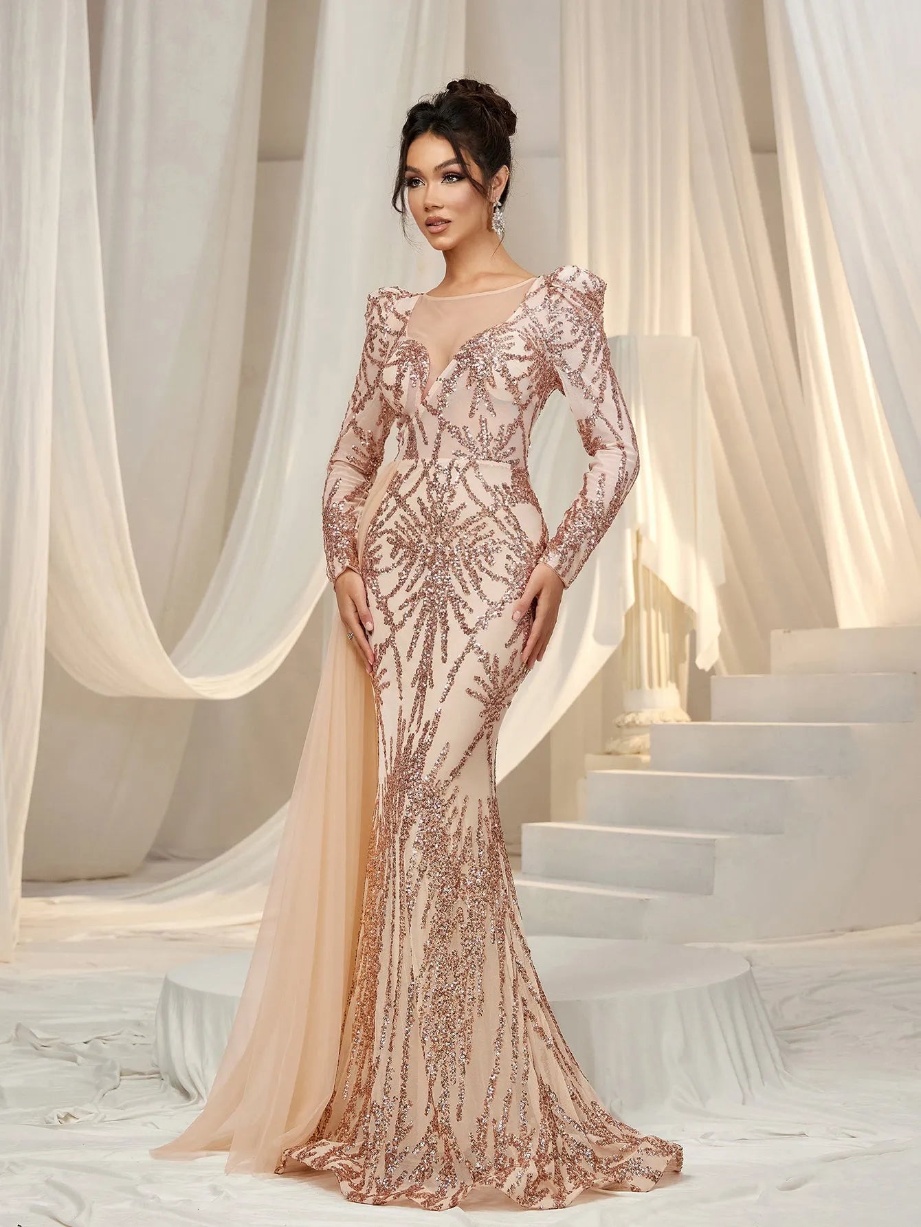 Exude grace and glamour with our elegant sequin gown. This exquisite dress features a fitted silhouette adorned with intricate sequin patterns, creating a stunning visual effect. The long sleeves and high neckline add a touch of sophistication, while the sheer detailing provides a hint of allure. The gown flows into a slight train, ensuring you make a grand entrance at any event.