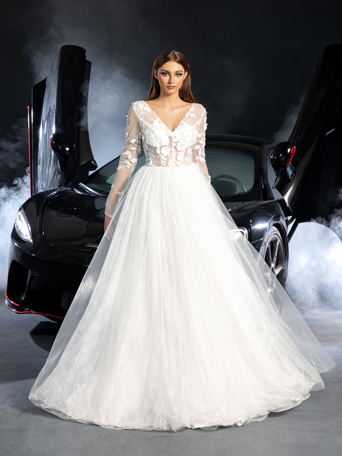 Elegant and timeless, this bridal gown is a masterpiece of sophistication. The gown features a V-neckline that accentuates the neckline while offering a touch of modesty. The sleeves are long and intricately embroidered with delicate lace details, adding a romantic flair to the overall design. The full-length tulle skirt creates a dramatic and ethereal silhouette, perfect for making a grand entrance on your special day.