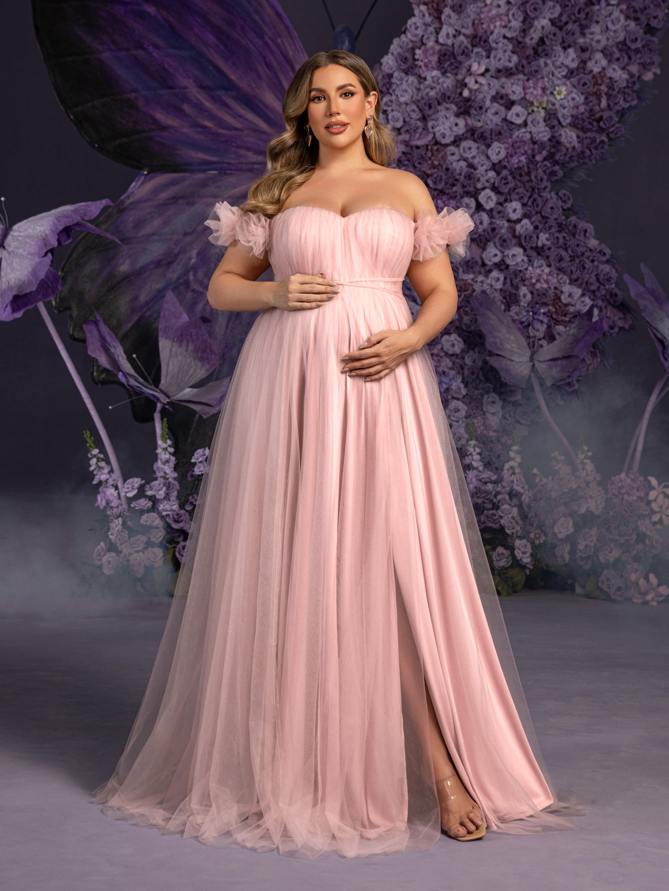 Radiate elegance with this exquisite maternity gown, crafted to enhance your natural beauty during this special time. The gown features a charming off-the-shoulder neckline adorned with delicate tulle sleeves, giving it a whimsical yet refined look. The soft tulle flows effortlessly from the empire waist down to the floor, highlighted by a daring front slit that adds a modern twist to this timeless silhouette. Perfectly balancing comfort and style, this gown is designed to make you feel both glamorous and confident.