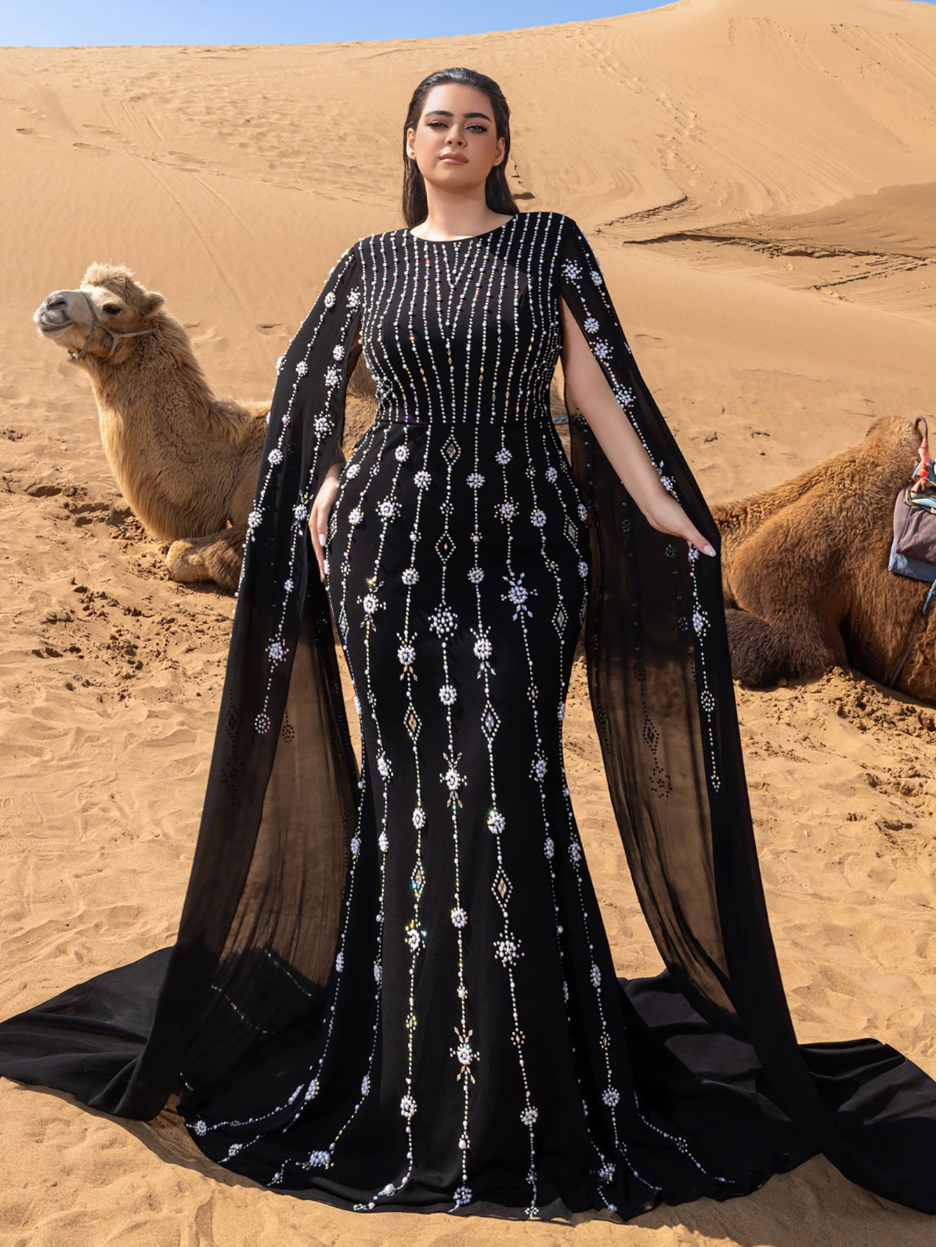 Design Highlights ✨ Architectural Glamour: This black rhinestone-encrusted gown redefines modern luxury with a body-sculpting silhouette and...