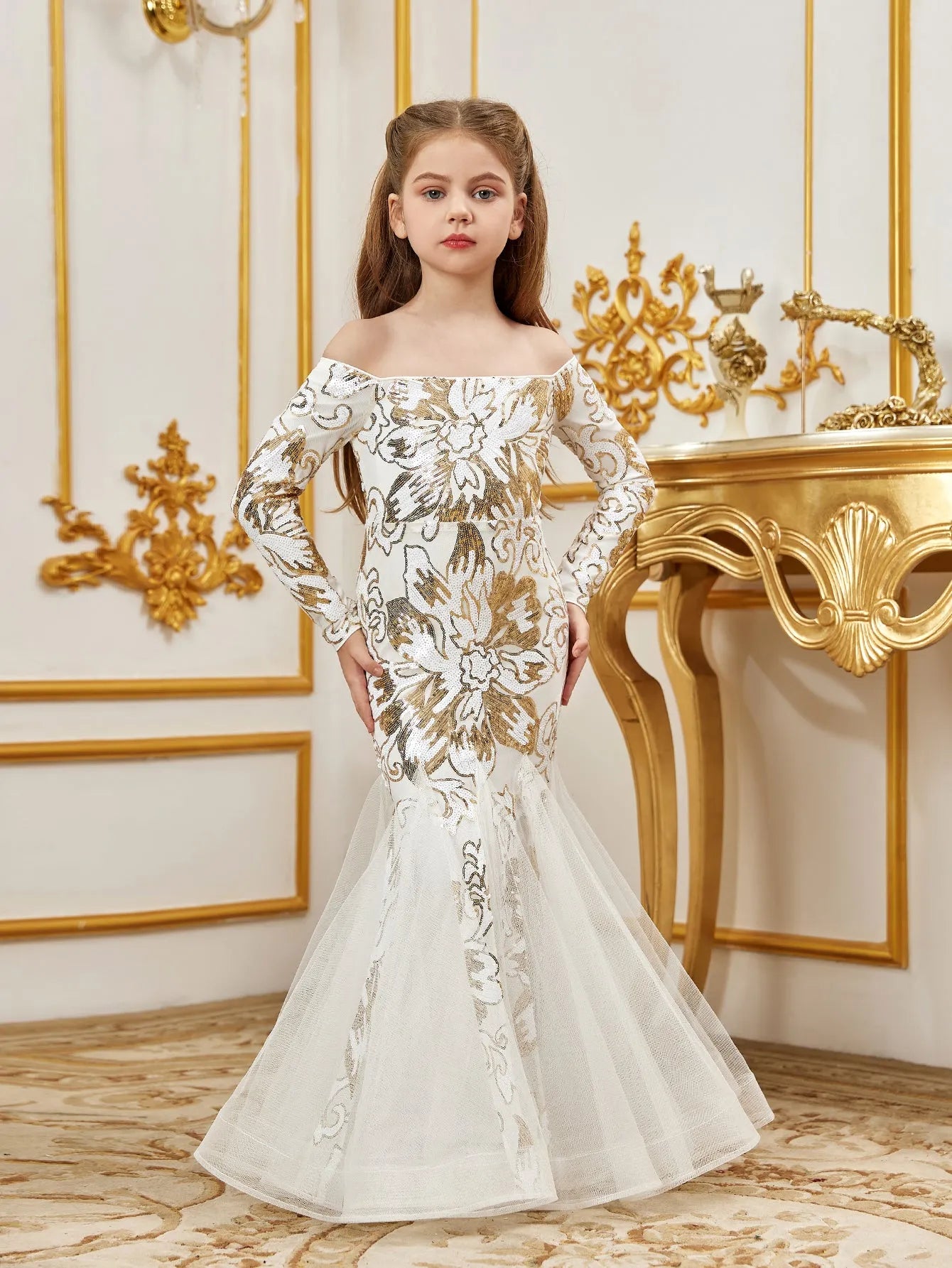 Let your little one shine in this enchanting off-shoulder mermaid gown, designed with elegance and a touch of grandeur. Crafted from high-quality fabrics, this gown features a delicate mix of shimmering gold floral patterns over a pristine white base, creating a refined yet playful look. The dress hugs the upper body and flares out at the bottom with a mesh mermaid-style hem, adding volume and movement to every step. With long sleeves and an off-shoulder neckline, it brings a classic and sophisticated style to your child’s wardrobe.
