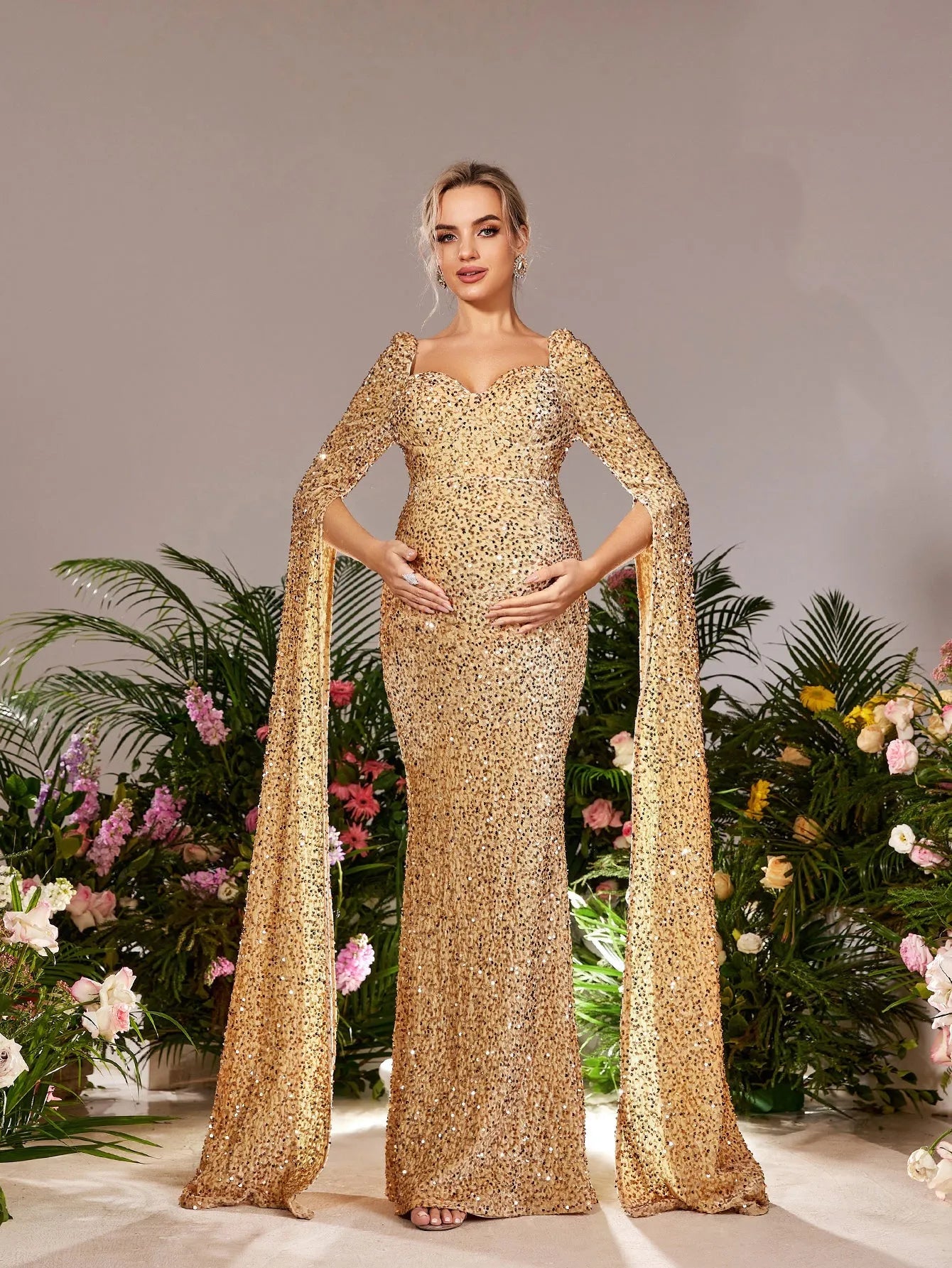 Elevate your maternity style with our dazzling gown, designed to make a stunning statement at any special occasion. This gown features a figure-flattering, body-hugging silhouette adorned with shimmering sequins that catch the light with every step. The dramatic long sleeves cascade into elegant drapes, adding a touch of sophistication and glamour to the overall look.