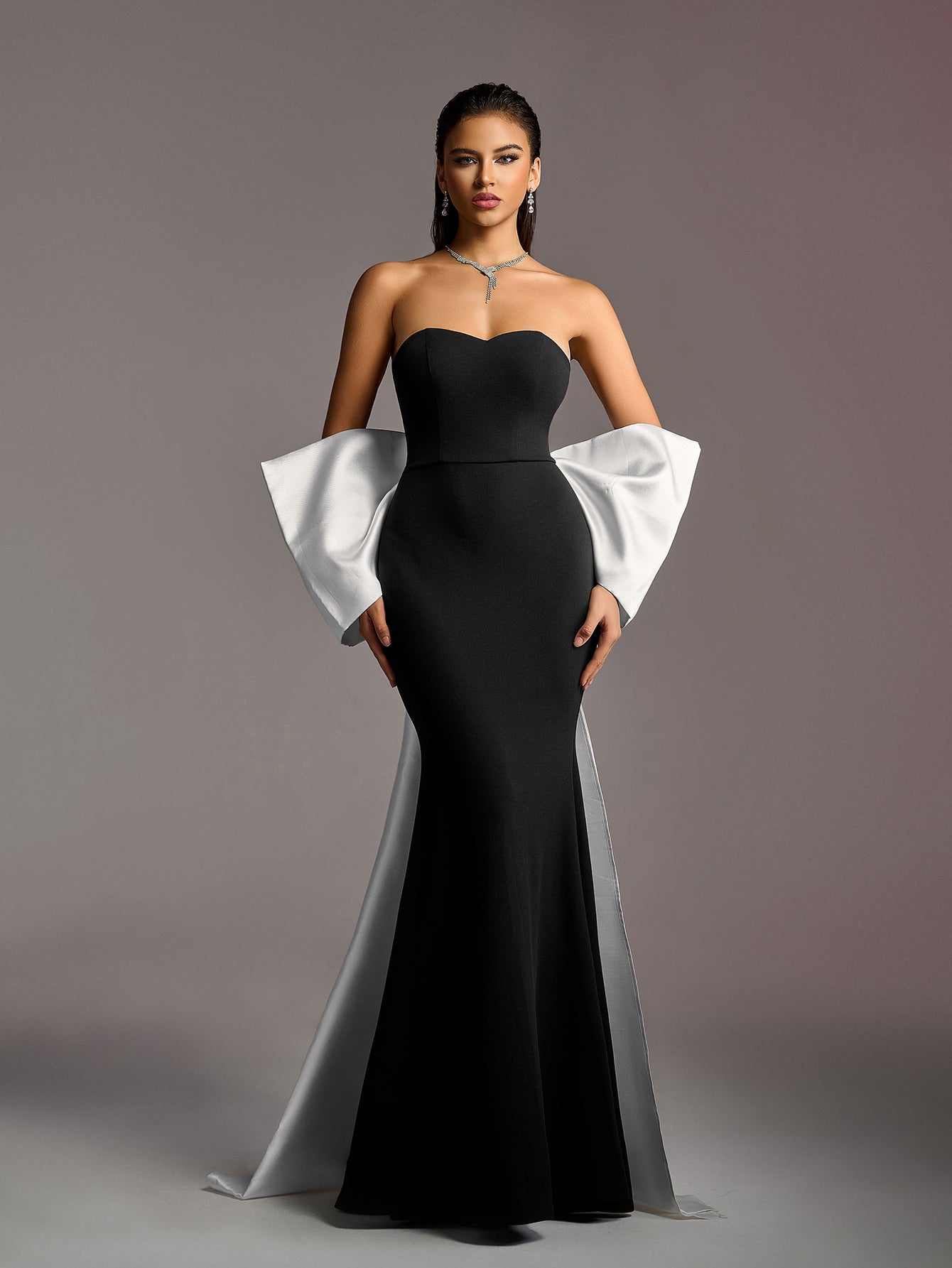 Elevate your elegance with our stunning evening gown, featuring a sleek backless design that exudes sophistication. The gown is adorned with a dramatic large bow at the back, adding a touch of glamour and uniqueness. The combination of black and white colors creates a classic and timeless look, while the flowing train adds a dramatic flair.