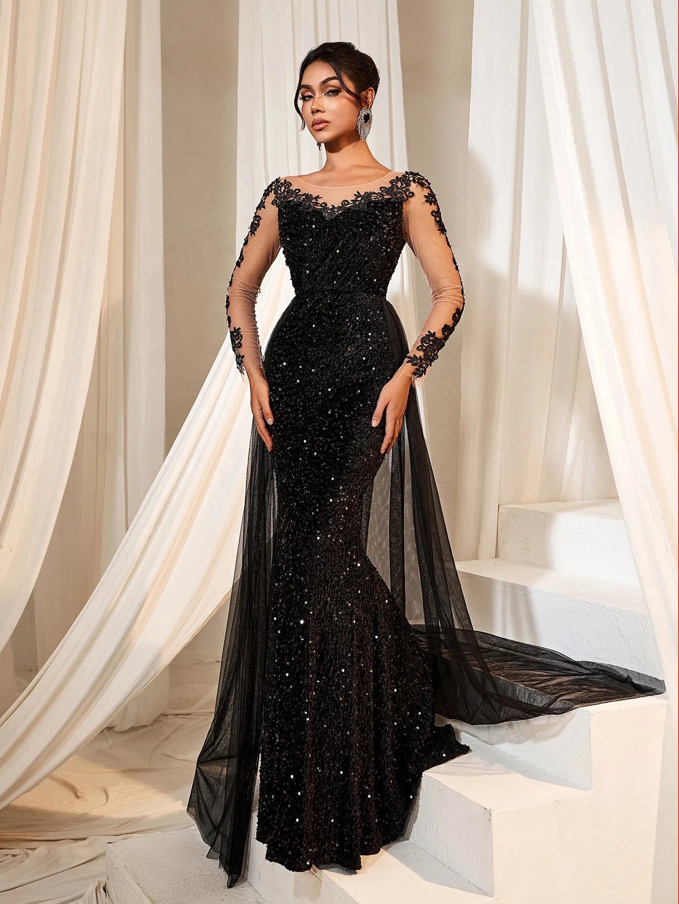 Turn heads with our breathtaking sequin mermaid gown, designed to make a dramatic statement. This exquisite dress features a delicate sheer mesh neckline and long sleeves adorned with intricate lace appliqués, creating a stunning contrast against the sparkling sequins. The figure-flattering mermaid silhouette is accentuated by a flowing tulle train that adds elegance and movement to your every step.
