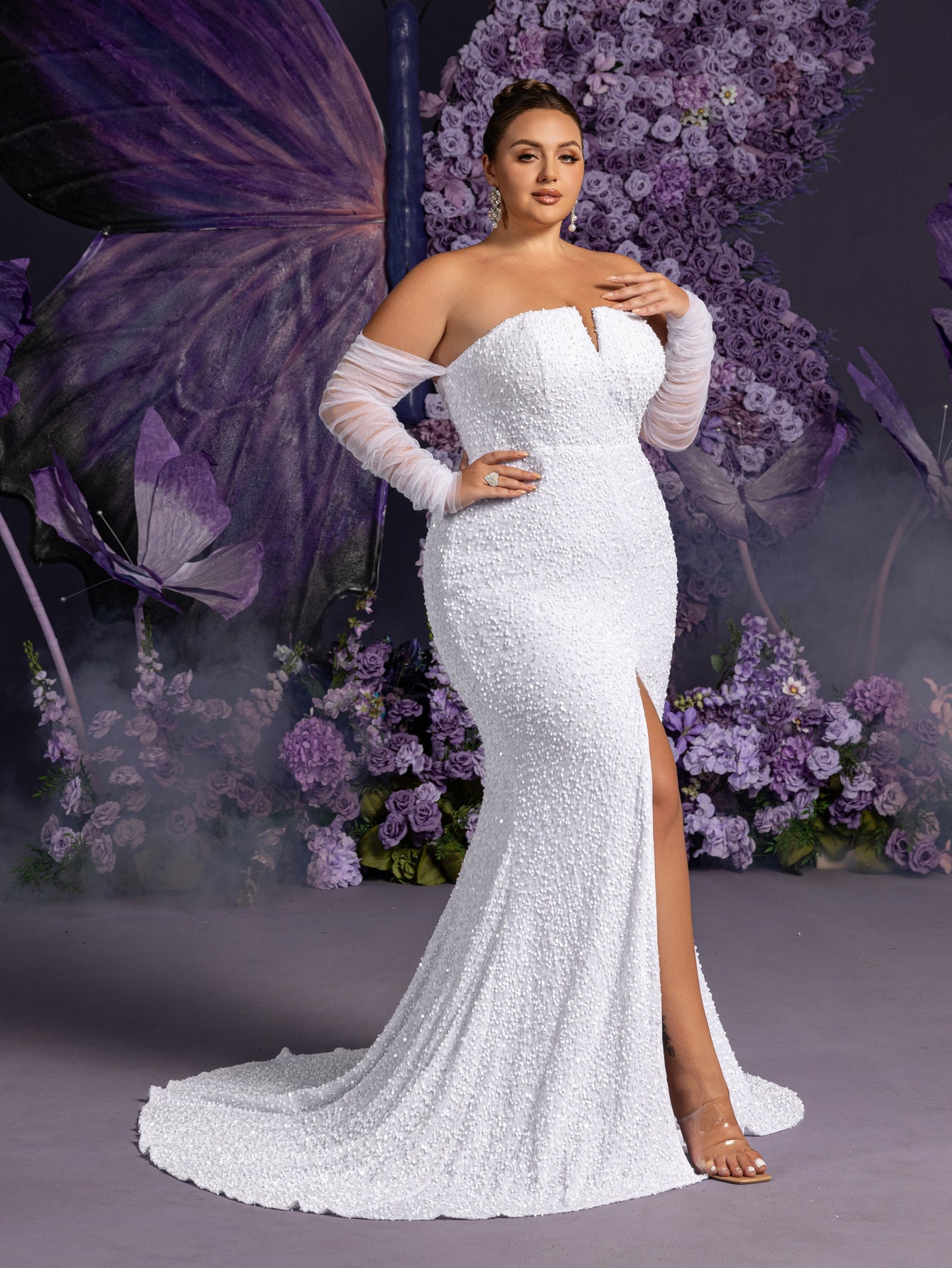 Plus Sheer Sleeves Split Mermaid Hem Sequin Tube Wedding Dress