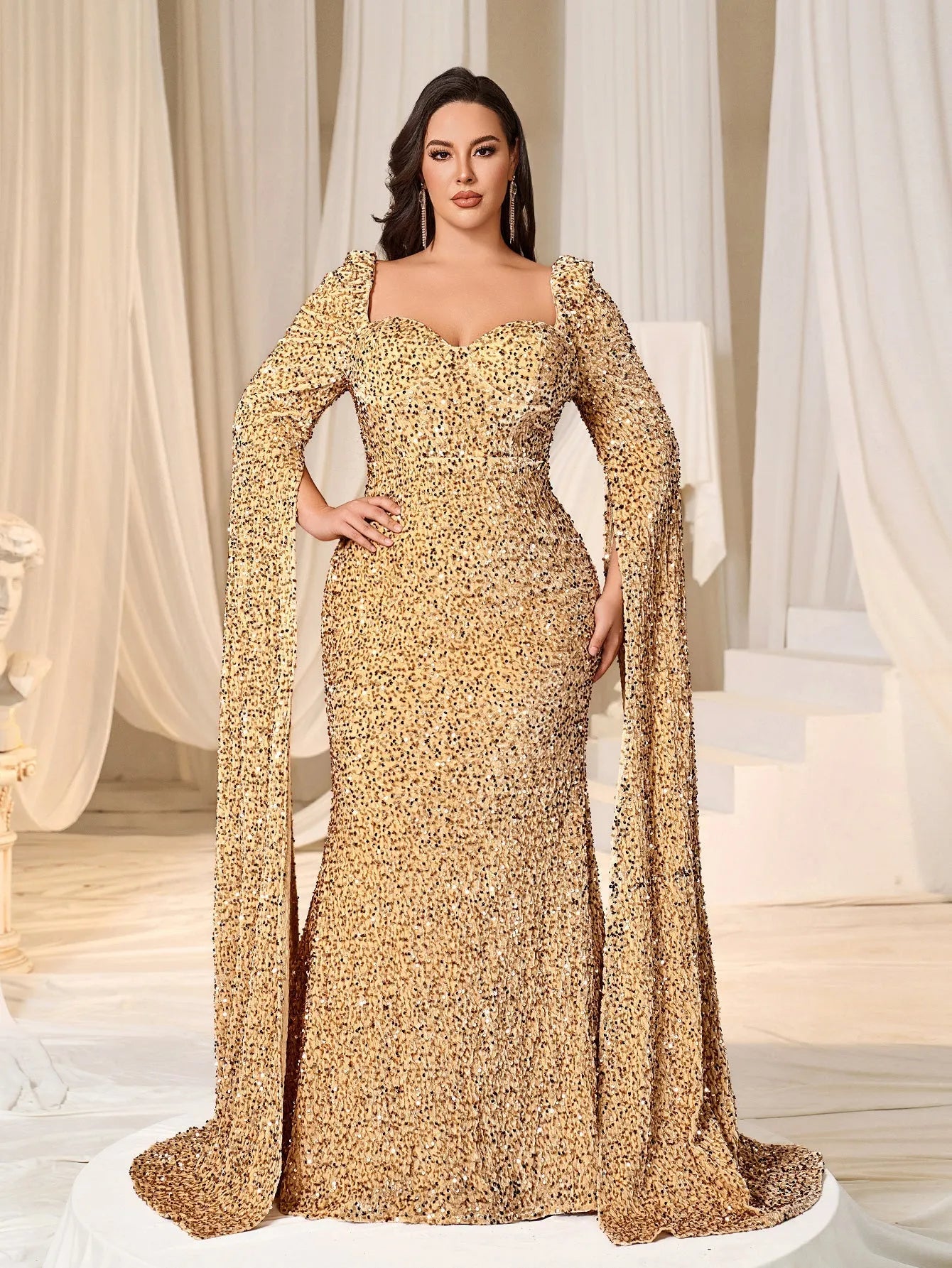Make a show-stopping entrance in this stunning sequin gown, designed to dazzle from every angle. The dress features a flattering sweetheart neckline and fitted bodice that beautifully accentuates your curves. The dramatic long cape sleeves add a regal touch, while the full-length skirt flows elegantly for a look of pure glamour and sophistication.