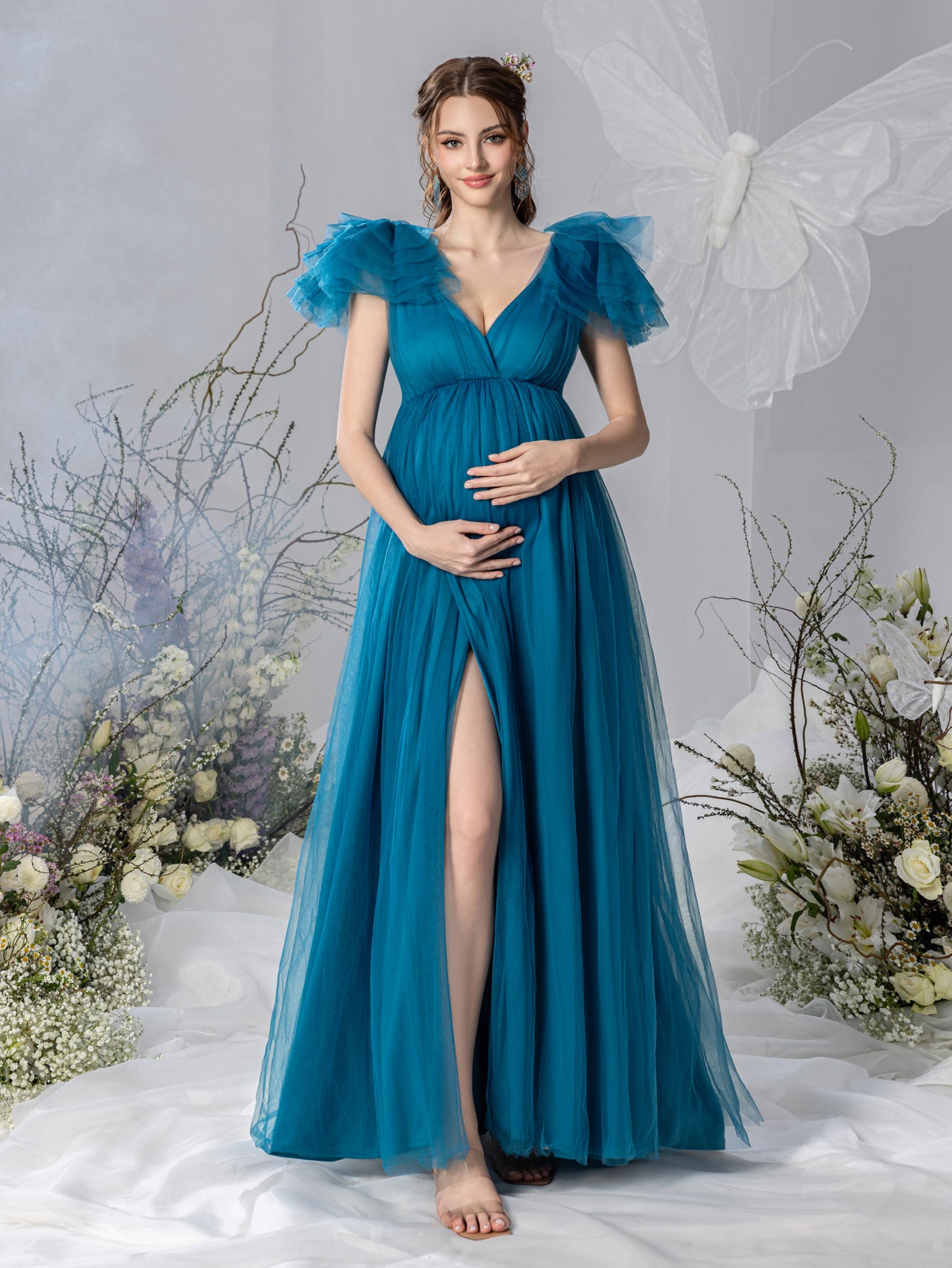 Embrace your elegance and grace with our stunning maternity gown, perfect for celebrating your beauty during this special time. The gown features a deep V-neckline and a figure-flattering silhouette that gracefully drapes over your bump, ensuring both comfort and style. The soft, flowing fabric creates a dreamy and ethereal look, enhanced by the delicate ruffle details on the sleeves and the daring high slit on the skirt.