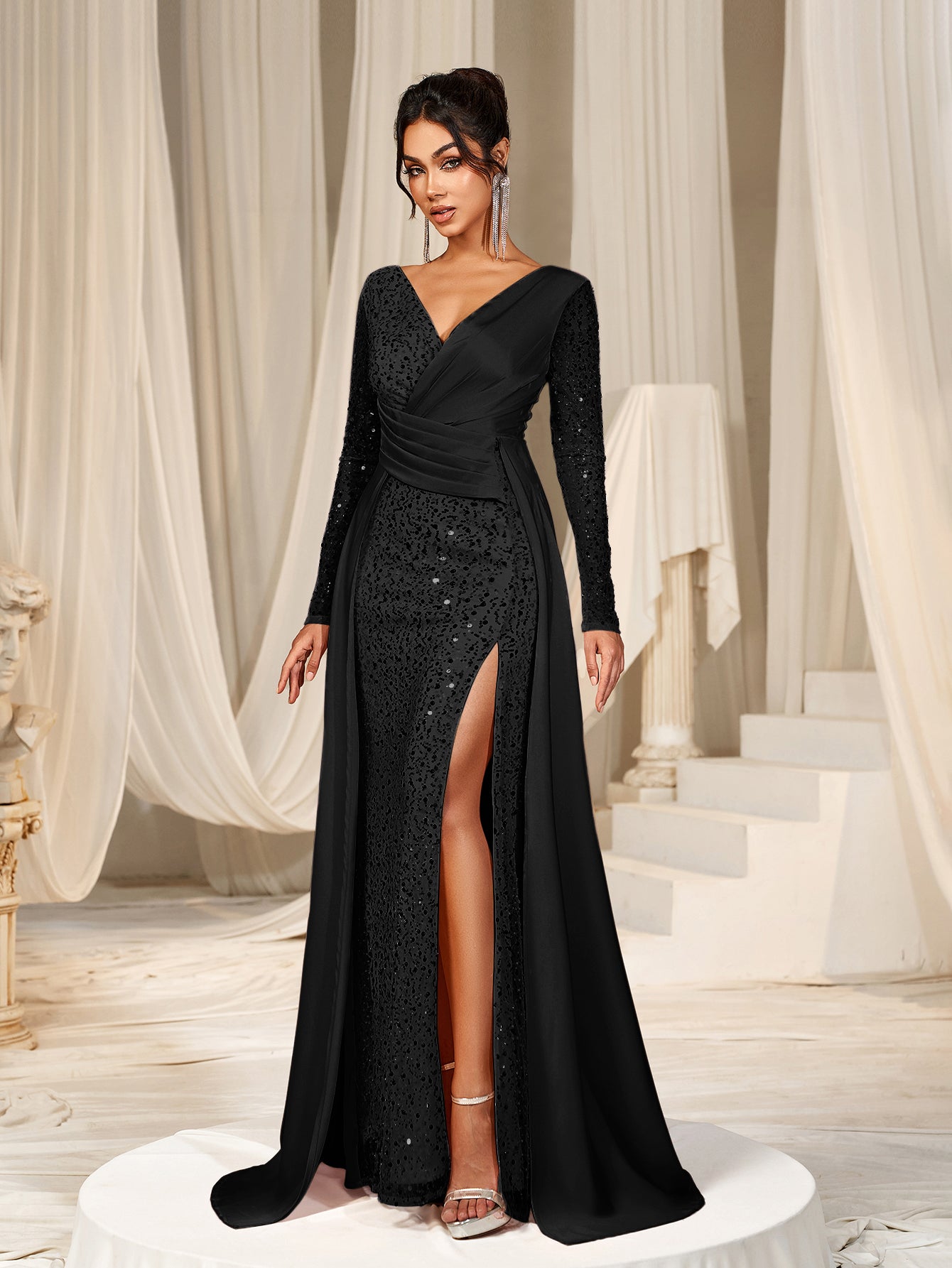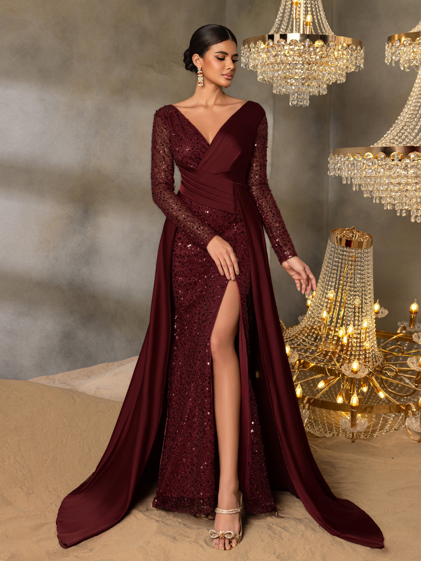 Sequin Evening Gown with Sheer Long Sleeves, Deep V-Neck & Back V-Cut | Elegant High Slit Formal Dress for Special Occasions