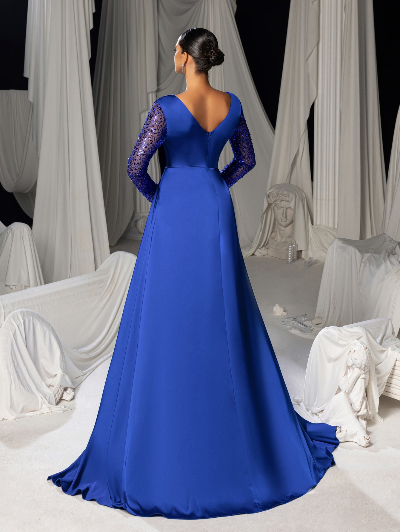 • Sleeves: Long sleeves crafted from sheer mesh fabric, entirely embellished with shimmering sequins—delivering dazzling sparkle while maintaining an ethereal feel. The sleeves extend from shoulder to elbow, framing the arms elegantly.