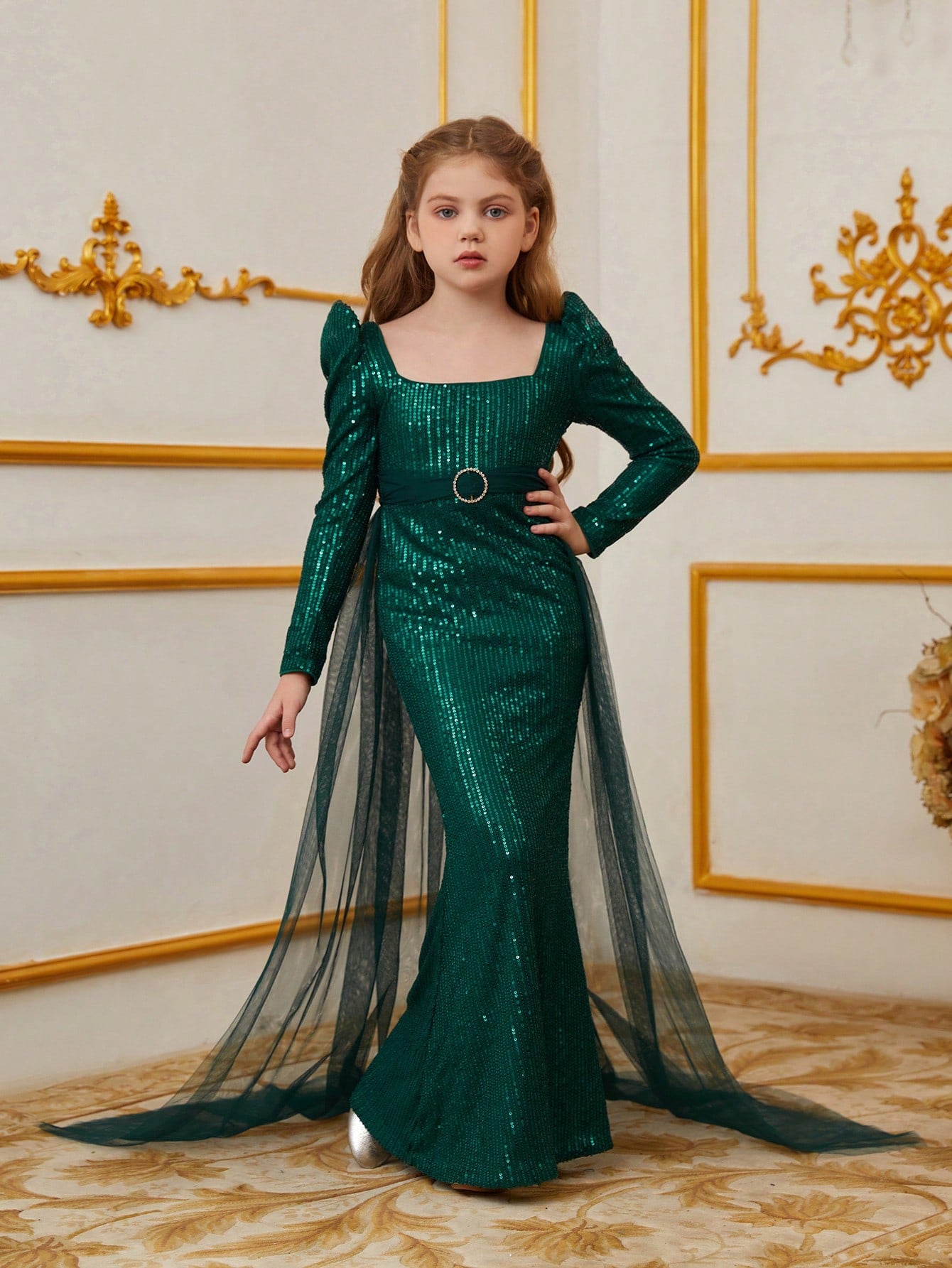 Step into a world of magic and elegance with our stunning children's gown, perfect for making cherished memories. The gown boasts a square neckline and a form-fitting silhouette that accentuates the innocence and charm of childhood. The glittery sequined fabric paired with delicate tulle creates a dazzling effect, enhanced by the flowing tulle details along the skirt.